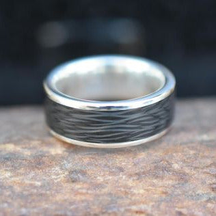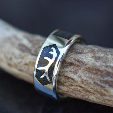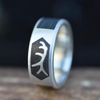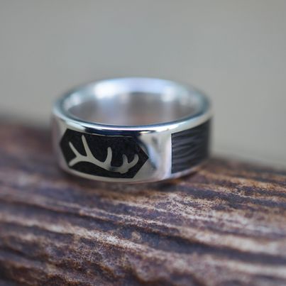 The Backcountry Outdoorsmen was created and named after the men and women who spend countless days and months in the desolate wilderness chasing one of the greatest species we hunt in North America. The Rocky Mountain, Roosevelt, Tule, and Manitoba Elk. These hunters are the backbone of our industry. If you want something done and done right, you ask one of them. Preparing for the hunt is not a seasonal task but a year-round lifestyle. To even have a chance at harvesting one of the majestic creatures with your bow, you must be in optimum shape. The rugged terrain the animals thrive in is not for the faint-hearted and will not only break you but kill you if you’re not ready for the task at hand. This design can be made in Silver, White Gold, Rose Gold, Yellow Gold, and Platinum. The black around the antler is a carbon arrow from a buck I harvested. You can send in your carbon arrow to be used in the ring, and even cremation ashes can be added under the carbon fiber. This design comes in a polished or brush finish option with a carbon fiber Inlay that wraps around the back of the band. This band is 8mm wide and comfort fit. (Photos for this design are in white gold. If you’re on a budget the same exact look can be achieved with silver.)