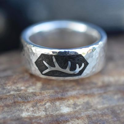 The Backcountry Outdoorsmen was created and named after the men and women who spend countless days and months in the desolate wilderness chasing one of the greatest species we hunt in North America. The Rocky Mountain, Roosevelt, Tule, and Manitoba Elk. These hunters are the backbone of our industry. If you want something done and done right, you ask one of them. Preparing for the hunt is not a seasonal task but a year-round lifestyle. To even have a chance at harvesting one of the majestic creatures with your bow, you must be in optimum shape. The rugged terrain the animals thrive in is not for the faint-hearted and will not only break you but kill you if you’re not ready for the task at hand. This design can be made in Silver, White Gold, Rose Gold, Yellow Gold, and Platinum. The black around the antler is a carbon arrow from a buck I harvested. You can send in your carbon arrow to be used in the ring, and even cremation ashes can be added under the carbon fiber. This design comes in a hammered polished or hammered brush finish option. This band is 8mm wide and comfort fit. (Photos for this design are in white gold. If you’re on a budget the same exact look can be achieved with silver.)