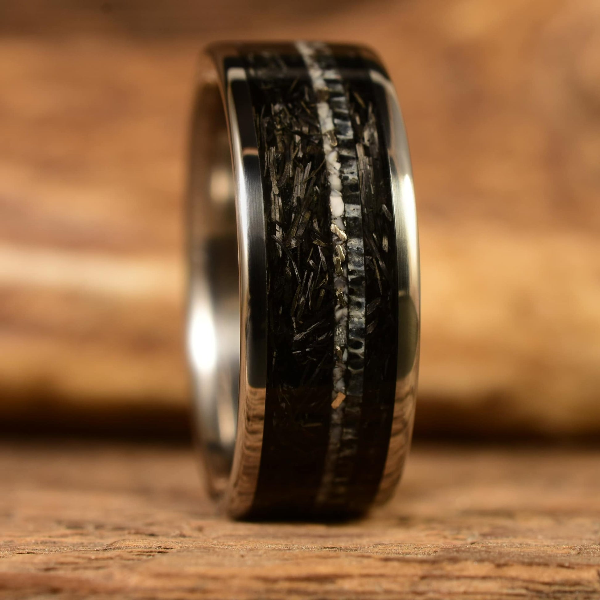The Carbon Legacy has a hand-machined aerospace grade 5 titanium band. The black inlay in this design is carbon arrow. You can send your arrow or use mine for the inlay. The center inlay is crushed elk Ivory and White Gold mixed. You can send in your ivory, or I can use mine. The inlay next to that is Dark Elk Antler. I have any species you can think of; if I don’t, you can let me know, and I will find it. You can also send in your antler. For the look in this photo, select a dark antler option. I thought this would be a great design for people who have the arrow from their biggest buck, bull, or meaningful hunt they went on. I like adding the options to send in your arrow, ivory or antler so that your ring can be as sentimental as possible. Please text or call me (Stephen) if you have any questions. 541-414-7938 All sales final.